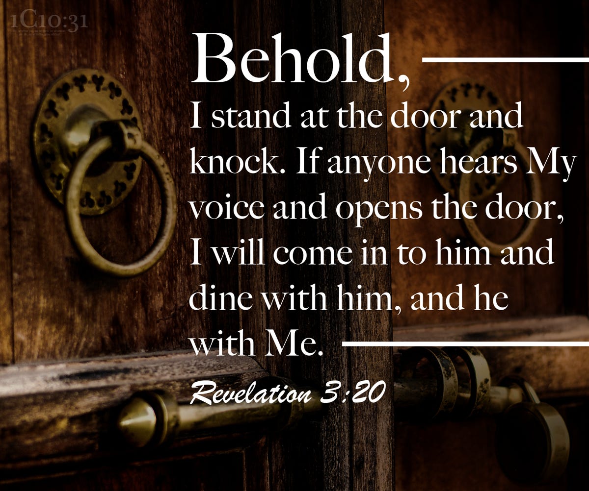 Revelation 3:20 LEB Behold, I stand at the door and knock! If anyone hears my voice and opens the door, indeed I will come in to him and dine with him, and he with me.