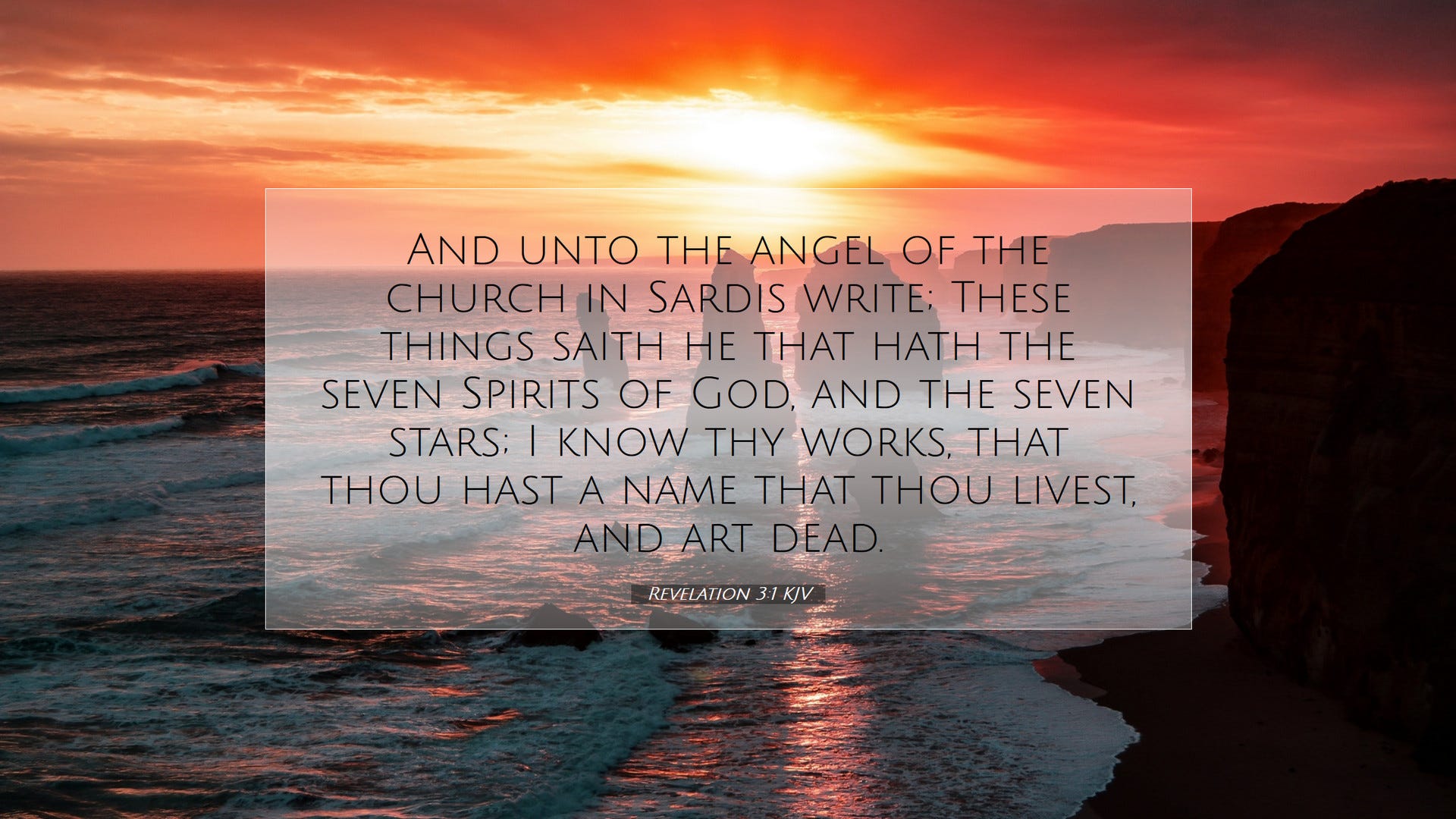 Revelation 3:1-6 KJV And unto the angel of the church in Sardis write; These things saith he that hath the seven Spirits of God, and the seven stars; I know thy works, that thou hast a name that thou livest, and art dead. (2) Be watchful, and strengthen the things which remain, that are ready to die: for I have not found thy works perfect before God. (3) Remember therefore how thou hast received and heard, and hold fast, and repent. If therefore thou shalt not watch, I will come on thee as a thief, and thou shalt not know what hour I will come upon thee. (4) Thou hast a few names even in Sardis which have not defiled their garments; and they shall walk with me in white: for they are worthy. (5) He that overcometh, the same shall be clothed in white raiment; and I will not blot out his name out of the book of life, but I will confess his name before my Father, and before his angels. (6) He that hath an ear, let him hear what the Spirit saith unto the churches.
